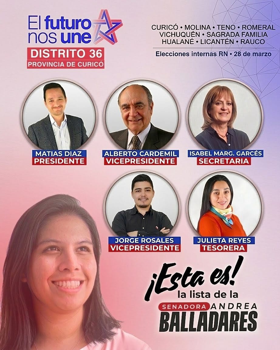 “En la provincia de Curicó, ¡el futuro nos une!” señala el eslogan de la lista que postula a dirigir los destinos de Renovación Nacional en la provincia de Curicó correspondiente al Distrito 36.